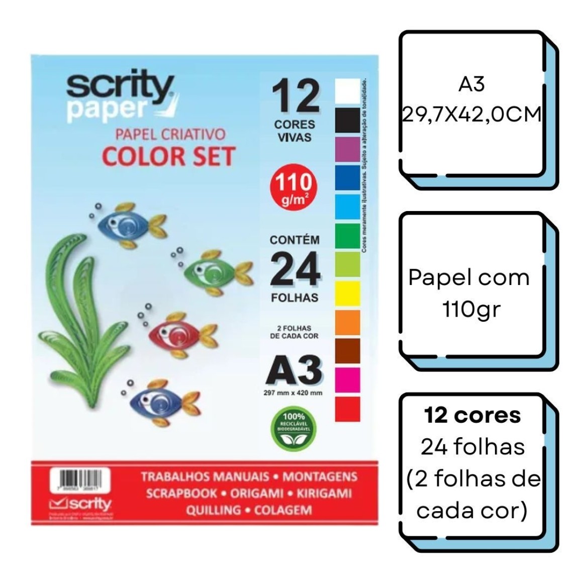 • Quantidade: 24 Folhas (2 folhas de cada cor)